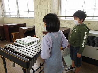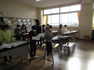 音楽科で「パフ」の曲の合奏に取り組んでいます。木琴、鉄琴の練習をしました。