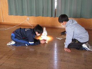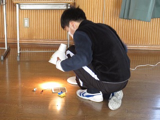 理科で蓄電器で作った電気であかりが点くか実験しました。