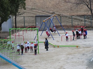 新しい遊具設置工事が終わりました。正しい使い方指導をしています。