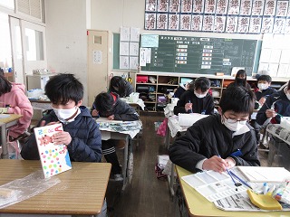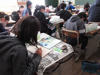 図画工作科で卒業制作に取り組んでいます。思い出を描き、色をつけています。