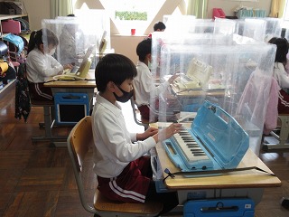 音楽科でけん盤ハーモニカの練習をしました。音を出さずに指使いの練習です。