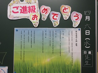 担任から最初のメッセージを黒板に書きました。始業式はリモートで行いました。