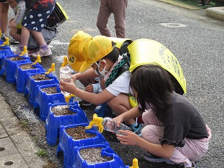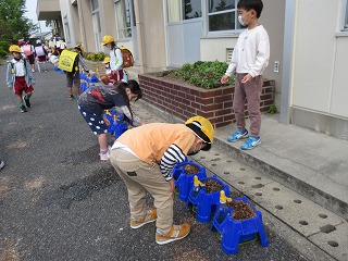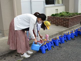 登校後、自分のアサガオに水やりをしています。