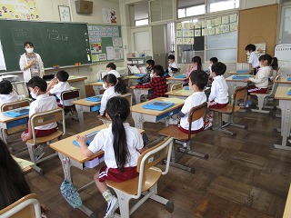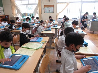 学習用タブレットを持ち帰ります。タブレットに健康観察の入力の仕方や持ち帰りの仕方を学びました。