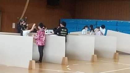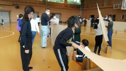 防災学習をしています。段ボールの間仕切りを作っています。