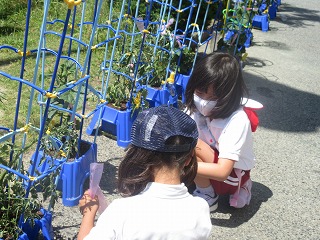 生活科で育てている野菜が伸びてきました。つるをしばって固定しました。