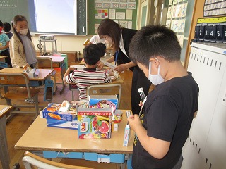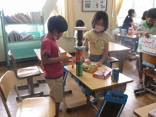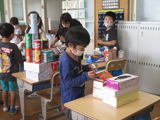 算数科と図画工作科を組み合わせて、箱を使った形づくりをしました。