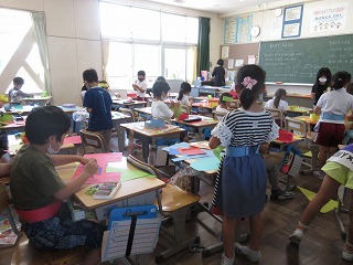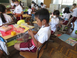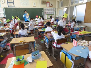 図画工作科でわっかを作って頭にかぶるものを作っています。