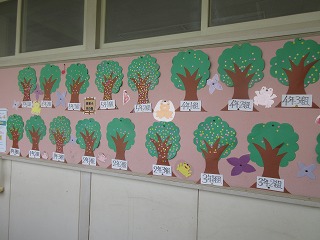 図書館でたくさんの本を借りて読むことができるように、本を借りたら、各学級の木にシールを貼っています。