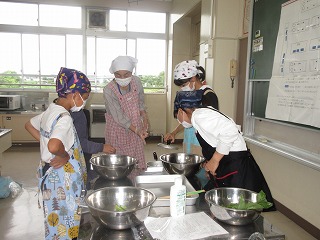 5年生 公開日 2022/07/08 更新日 2022/07/08 各学年から 家庭科で調理でゆでる学習をしました。ホウレンソウをゆでてお浸しにしました。安全に活動できるように地域ボランティアの方に見守っていただきました。