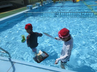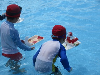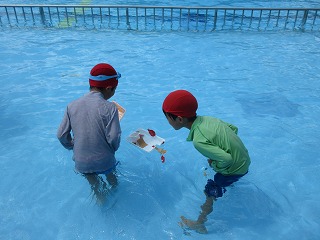 生活科で作った風で動く船をプールに浮かべました。