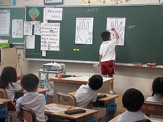 養護教諭が手洗いの授業をしました。手洗いの仕方を見直しました。