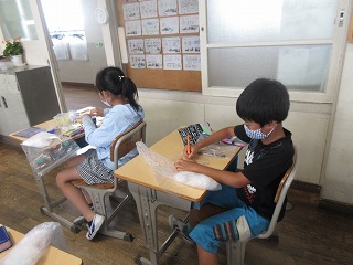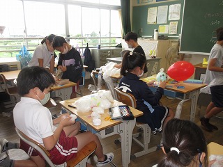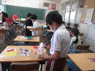図画工作科でカラフルランドに取り組んでいます。色や形を工夫していろいろな動物や生き物などを作っています。