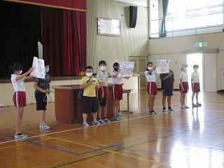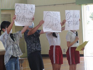 企画委員が、夏休みに交通安全を心がけること、規則正しく生活すること、メディアとのかかわり方をクイズや劇にして発表しました。