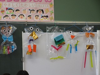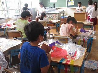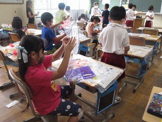 図画工作科で「ひらひらゆれて」の学習をしています。ゆらゆらゆれて楽しい作品を作っています。
