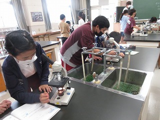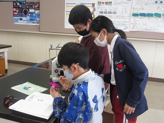 理科でアサガオのおしべの観察をしました。顕微鏡で見ました。
