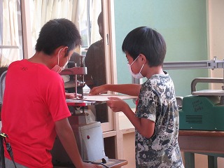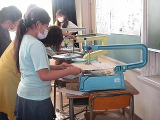 図画工作科で伝言板を作っています。電動のこぎりを使って形を切りました。