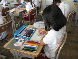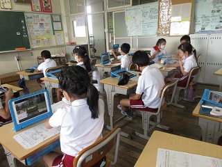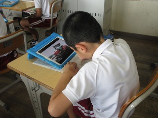 社会科で米作りについて学習しています。米作りに使う機械をタブレットで調べました。