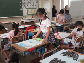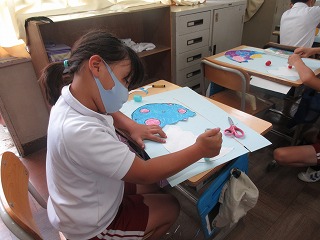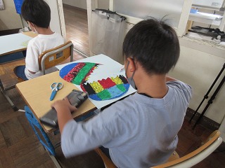 図画工作科で「たまごから生まれた世界」を描いています。自分の思い描く世界の卵と卵が割れたところを描きました。