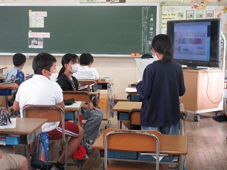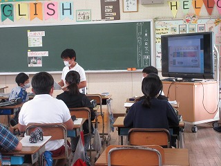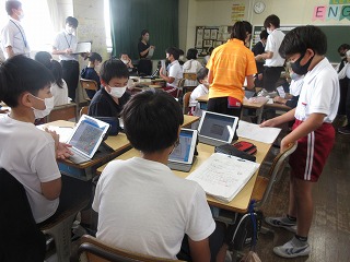 社会科で米作りの課題を解決する方法を考えました。タブレットに入れた資料を根拠に自分の考えを友達に伝えました。