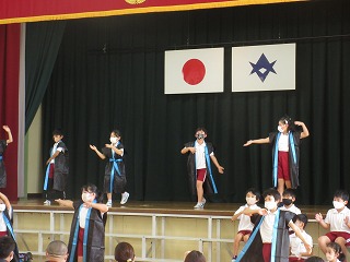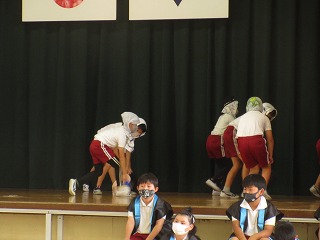 学習発表会でした。若林座のことを説明しました。若林のうた、チャラボコ、どじょうすくいを発表しました。