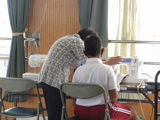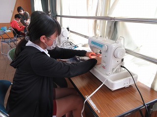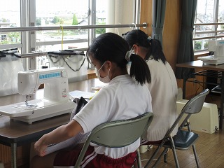 家庭科でナップザックを作っています。地域の方にミシンぬいを支援していただきました。