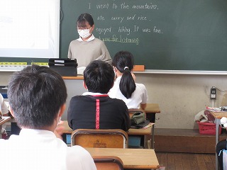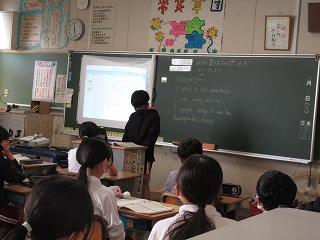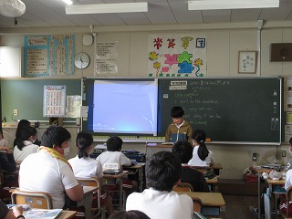 外国語科で夏休みのできごとを英語で発表しました。タブレットで写真など資料を見せながらスピーチしました。