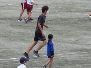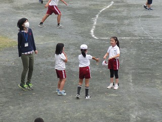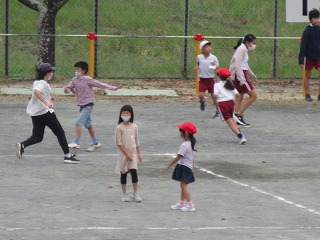 休憩時間に先生と一緒に鬼ごっこをして遊びました。