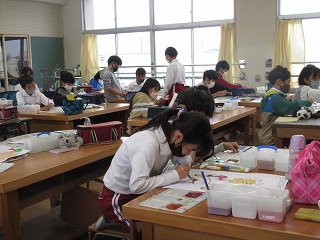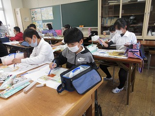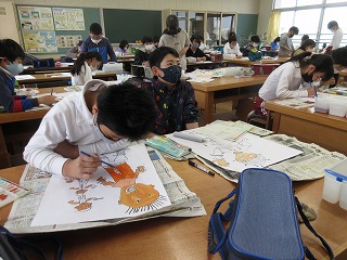図画工作科で読書感想画を描いています。「ガリバー旅行記」を読んで、心に残ったところを描いています。