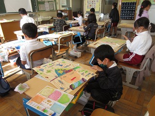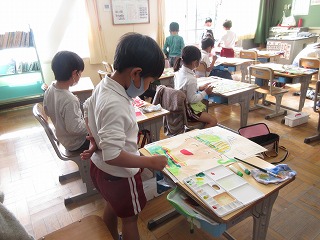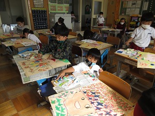 図画工作科で、お話の本を読んで心に残ったことを描いています。