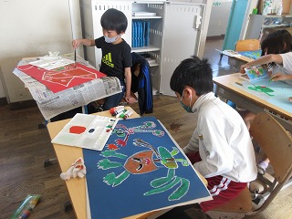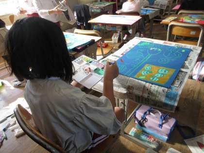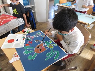 図画工作科で読書感想画を描いています。「スイカぼうず」の話で心に残ったことを描いています。