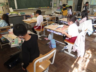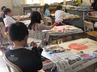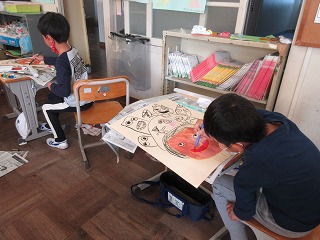 図画工作科でお話の絵を描いています。色を工夫しています。