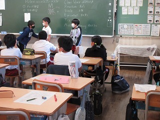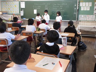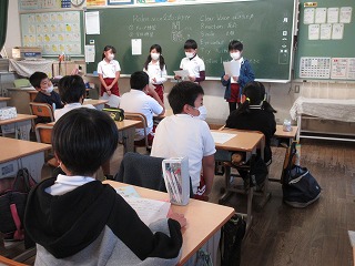 外国語活動で自己紹介の練習をしました。フィリピンに住んでいる方と交流するためです。