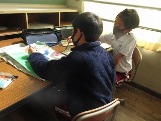 図画工作科で読書感想画を描いています。ガリバー旅行記を読んで、心に残ったことを描いています。