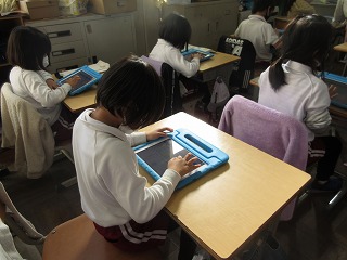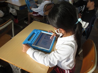 算数科で三角形と四角形の学習をしています。タブレットのワークを使った三角形と四角形の仲間分けをしました。