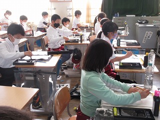 書写で「げんき」を毛筆で練習しました。