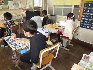 図画工作科でお話の絵を描いています。心に残ったことを大きく描いています。