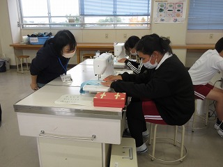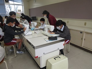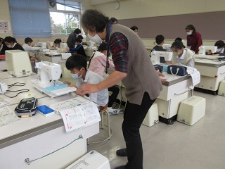 家庭科でミシンぬいをしました。糸のかけ方や直線縫いの仕方を学びました。ボランティアさんに見守っていただきました。