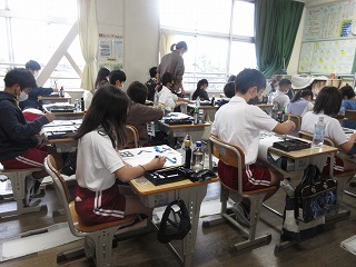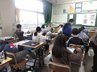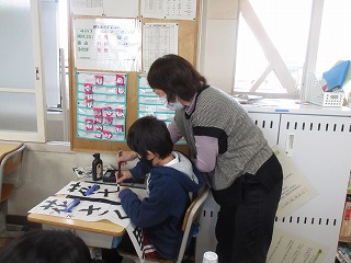 書き初め大会で書く「花さく里」を練習しました。書道家の先生に教えていただきました。