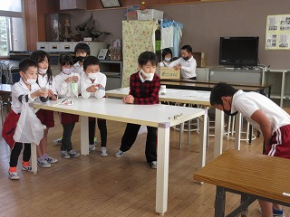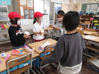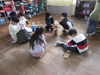 生活科でおもちゃまつりをしました。2年生が動くおもちゃを作りました。1年生を招待しました。的あて、車レース、糸電話、釣りなど楽しく遊びました。