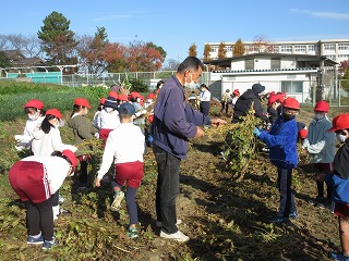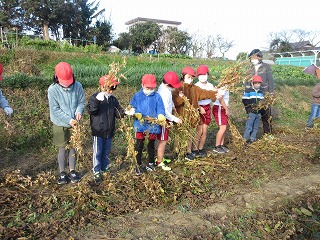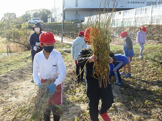 総合的な学習の時間に育ててきた大豆を収穫します。地域講師の方が刈り取りをしてくださいました。束ねて干す作業をしました。