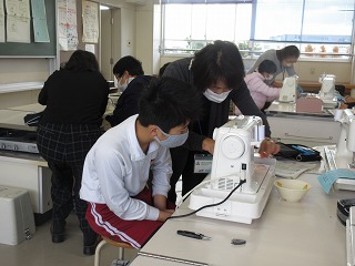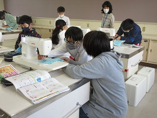 家庭科でミシンぬいをしました。地域ボランティアの方に見守っていただきました。
