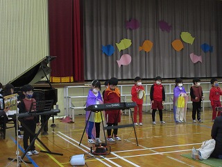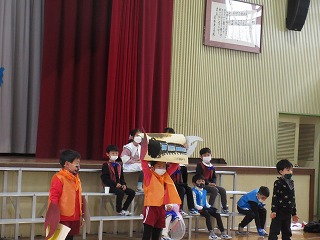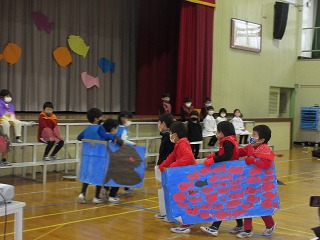 1年生 公開日 2022/12/13 更新日 2022/12/13 各学年から 学習発表会をしました。スイミーの劇を演じました。生活科で学習した昔遊び、国語科で学習した働く車クイズ、音楽科で学習したきらきらぼしの合奏も入れて発表しました。
