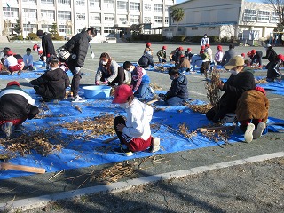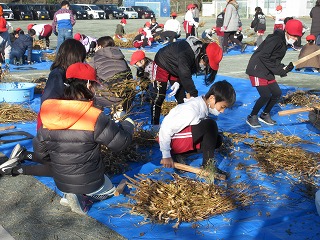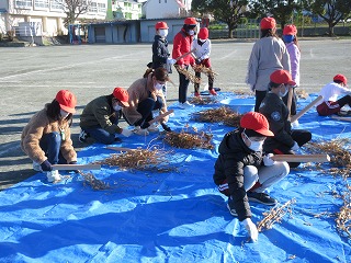 総合的な学習の時間に大豆を育ててきました。刈り取りしたものを干して乾かしました。今日は、豆たたきをして収穫しました。地域講師の方にやり方を教えていただきました。