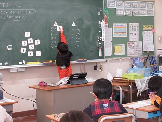 算数科で数あてクイズをしました。8+□=14など□に当てはまる数を考えました。