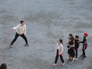 休憩時間に先生と一緒に遊びました。なわとび、鬼ごっこ、ボール投げなどをしました。