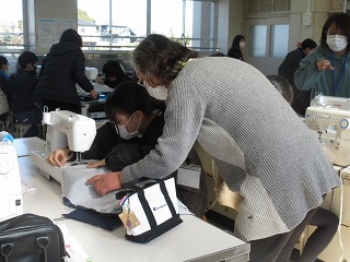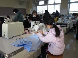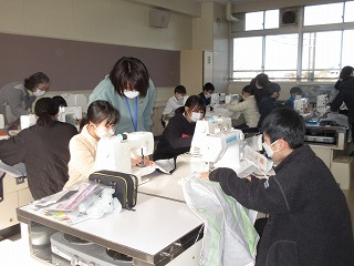 家庭科でエプロンを作っています。地域のボランティアの方に支援していただきながら、ミシン縫いをしています。