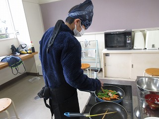 家庭科で調理実習をしました。一人一調理で野菜炒めを作りました。