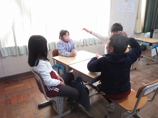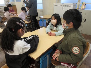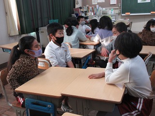 ソーシャルスキルトレーニング 公開日 2023/01/31 更新日 2023/01/31 校長室から 朝の15分の活動でソーシャルトレーニングをしています。グループに分かれて、好きな季節や色などを聞いたり、尋ねたりする活動をしました。