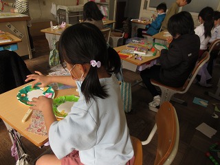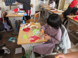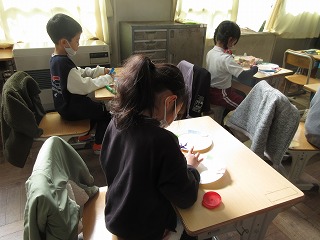 図画工作科で風で動くおもちゃを作っています。紙皿に模様を付けたり、色をぬったりして作っています。
